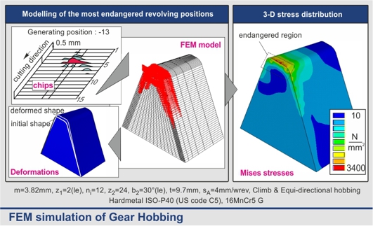 The wide, almost exclusive, application of gear hobbing, as a flexible manufacturing process for external gears has led to the thorough description of its kinematics, dynamics and tool wear mechanisms. However, in various cases, especially when cemented carbide or coated tools are utilized, the cutting tools experience critical stress components, which are able to cause premature tool failures. The complicated kinematics, as well as the particular tool geometry exclude analytical stress filed solutions, and require arithmetical ones conducted with the aid of the finite elements method. The computational results explain sufficiently the failure mechanisms, being in agreement with corresponding experimental data. The verified parametric FEM model was further applied for various cutting cases, indicating the most risky cutting teeth with respect to their failure danger. Herewith, the optimization of the cutting process is enabled, taking into account that a proper selection of cutting parameters can eliminate the failure danger of cutting tools, and achieve satisfactory cost effectiveness. | |