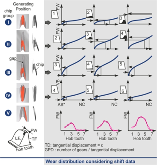 Gear hobbing is an efficient method of gear manufacturing. Due to the fact that during the cutting process every hob tooth always cuts in the same generating position, while in the various generating positions the formed chip has different geometry, the resulting tool wear is not uniform on any particular hob tooth. In order to overcome this problem, the hob is shifted tangentially after a certain number of cuts. Mathematical models to calculate the progress of hob wear in the individual generating positions, considering the existing process parameters, were presented. In order to calculate flank wear regarding the complicated chip geometry, equivalent chip dimensions, such as the cutting length l, the chip thickness hs and the characteristic chip form (chip group) were introduced. Based on these calculations, a computer algorithm for the determination of the hob flank wear, which depends on the shifting conditions, was presented.