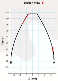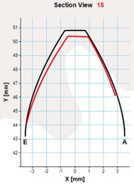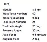 Τ he chip geometry of each cutting pass is identical for every cutting tooth, considering a stable depth of cut. However the chip geometry greatly differs between internal and external gears and it is modified depending on the axial feed of the manufacturing process. In specific, for a same module and cross axis angle, internal gear cutting chips are generally longer than those of external gears. In addition, raising the axial feed of the simulation chips with increased thickness are produced and by increasing the Cross Axis angle of the cutting tool, the chip is generally lengthened. The cutting forces are calculated by sectioning the 3D chip geometry at each revolving position of the tool trajectory. For each cutting section a 2D geometry is produced, which gives valuable information about the chip thickness and total area at the corresponding position. By positioning the cutting section along with the tool geometry, information about the affected tool area as well as the chip thickness along the unrolled cutting edge is extracted.